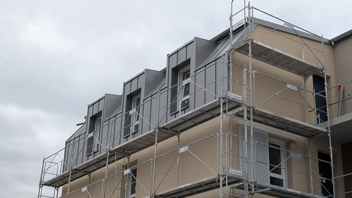 Ci-dessus : Exemple de bardage joint debout dans sa pure forme, posé en rampant ainsi qu’en retombée de façade. Exemple parfait pour illustrer mon propos, car ici est à la fois en toiture, et en façade. Magnifique chantier sur la comme de Saint Pierre de Bœuf (42). Crédit photo : S.USTUN / Google Pixel 9 PRO Zoom x2.