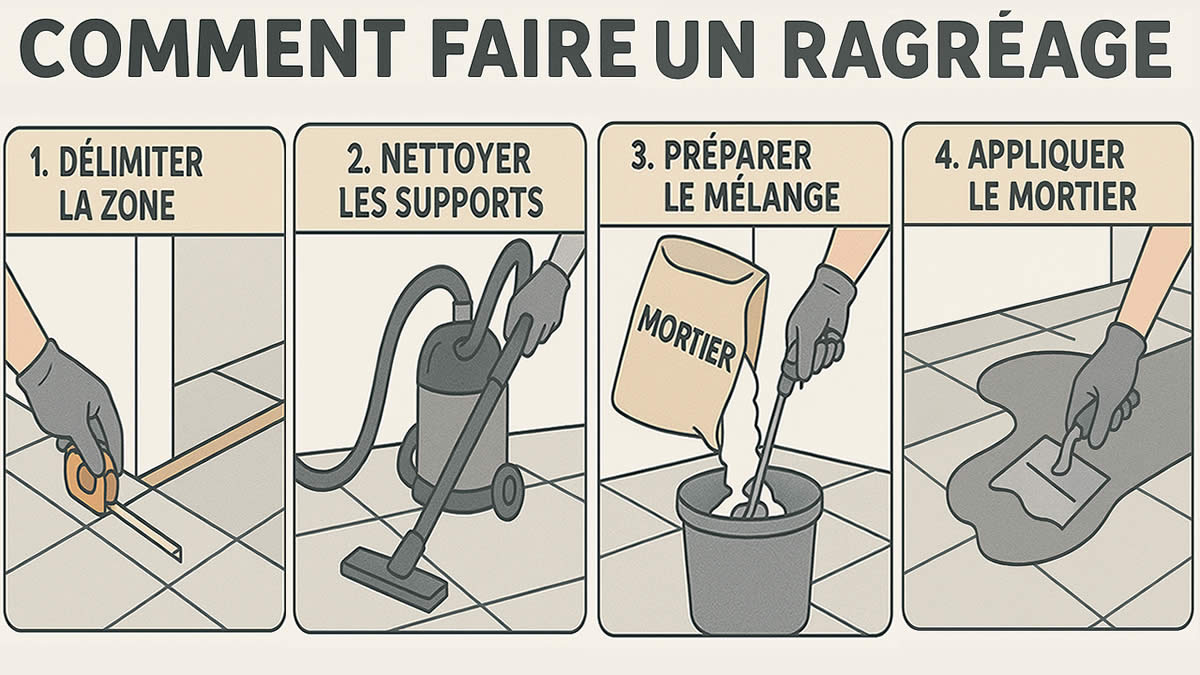- Ragréage autonivelant : Mortier fin et très fluide qui se nivèle automatiquement.