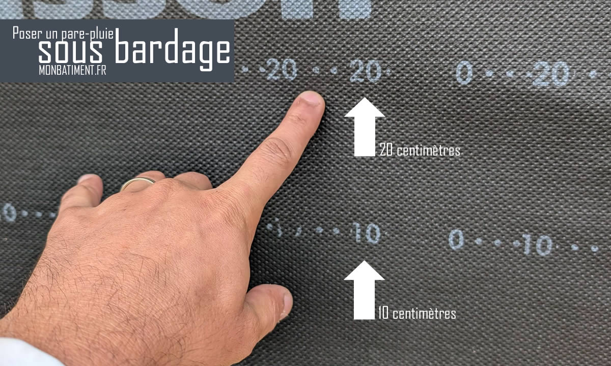 Le recouvrement est généralement indiqué sur le pare-pluie avec un marquage pour faciliter la pose (voir mon exemple ci dessus). Cela facilite grandement la pose car il suffit de s’aligner sur le marquage.