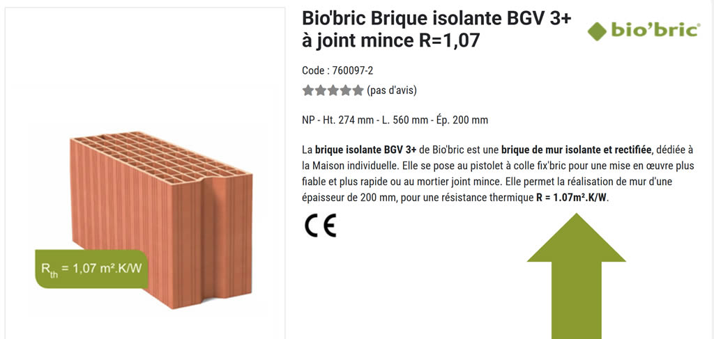 Ci-dessus : Brique de construction dont la résistance thermique est de 1.07 / Lien vers la page produit.