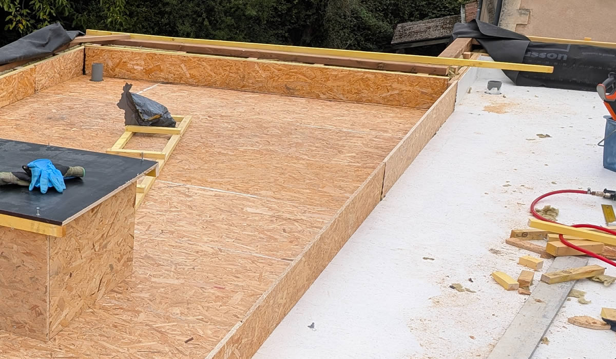 Ci-dessus : Test « in situ » d’un système d’étanchéité liquide pour les toitures terrasses. A gauche le support brut, à droit le support imprégné. La rédaction réalise ce chantier test afin de vérifier la pertinence de l’étanchéité liquide sur support bois. Crédit photo : S.USTUN / Google Pixel 9 PRO.