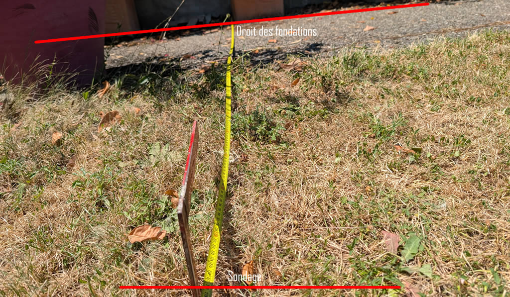 La zone de sondage est éloignée de plus de 2.80 mètres des fondations du auvent (voir ma photo ci-dessus). Autrement dit, il est parfaitement impossible pour le bureau d’étude comme pour l’expert de définir d’une éventuelle insuffisance de fondation. Pour définir la suffisance ou l’insuffisance de fondation, il faut sonder au droit de ces dernières. Tout autre raisonnement est empirique, et faussé.