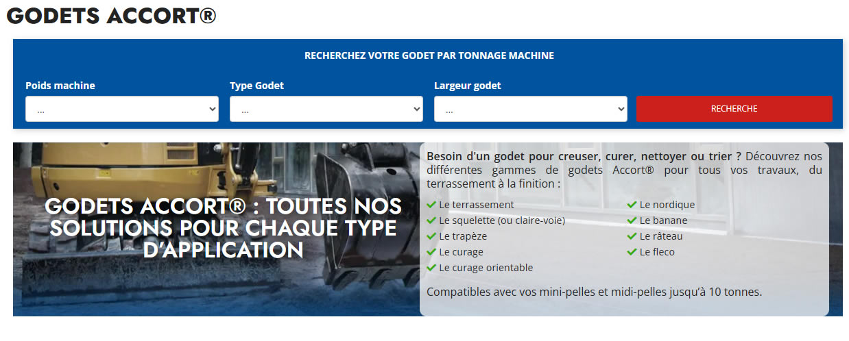 Pour les godets, le fournisseur propose des modèles clairement accessibles en termes de prix. Tous les types de godets sont disponibles dans la gamme (terrassement, curage, godet banane, griffes, etc.).