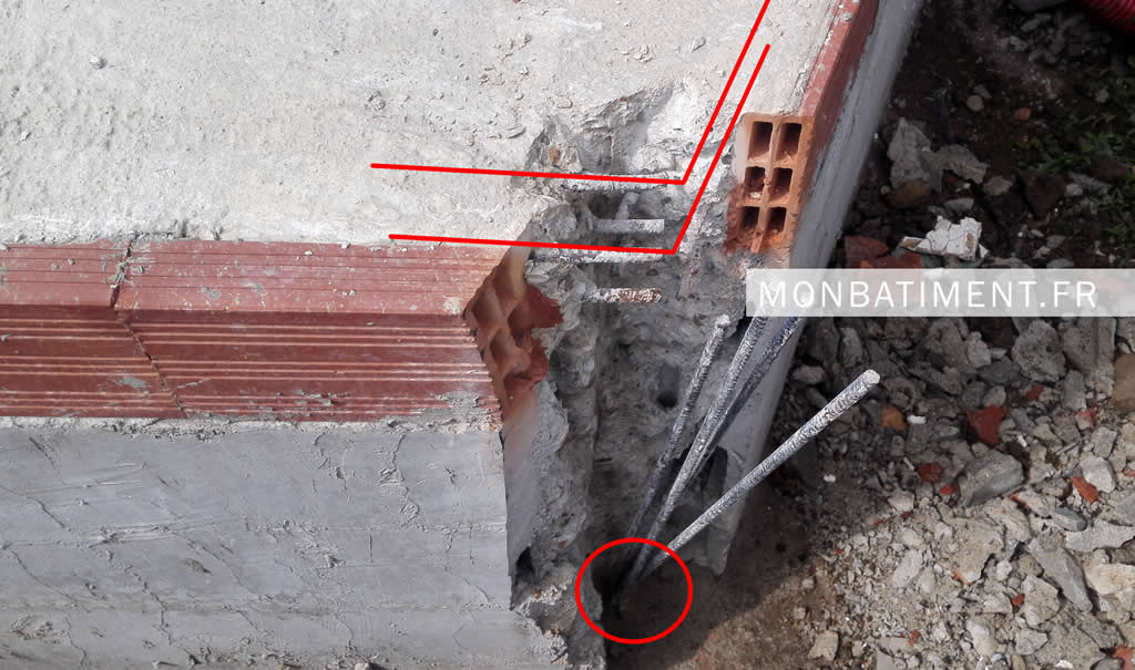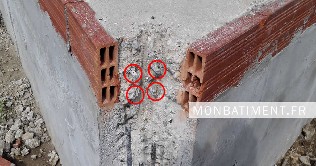 Figure 2 : Sur la photo ci-dessus, notez que les chainages horizontaux sont positionnés en limite périphérique au droit des planelles. Il n’y a donc pas suffisamment de matière d’enrobage (béton) ce qui annihile la fonction des fers à béton. Les attentes sont positionnées en « grappe », ce qui est un manquement aux règles de l’art.