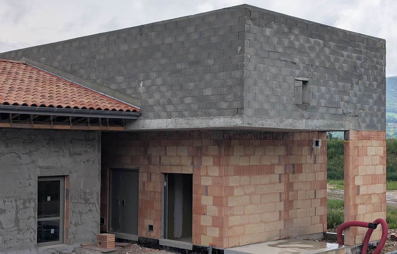 Enfin, et si vous vous posiez la question je me permets de vous apporter la réponse : Oui il est tout à fait possible de construire une maison à la fois en briques et en parpaings. Je vous en donne ici l’exemple concret avec une photo que j’ai prise sur un chantier en cours. Dans ce cas, nous pouvons remarquer que le rez-de-chaussée est réalisé en briques, alors que l’étage est en parpaing.