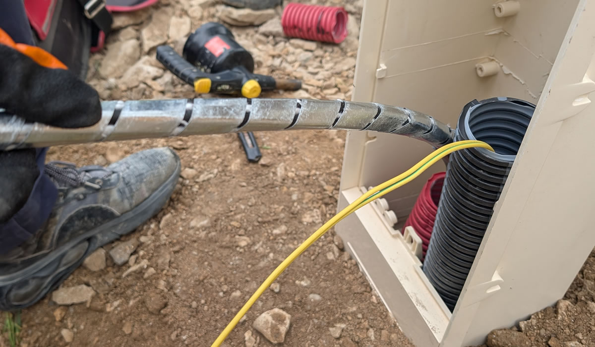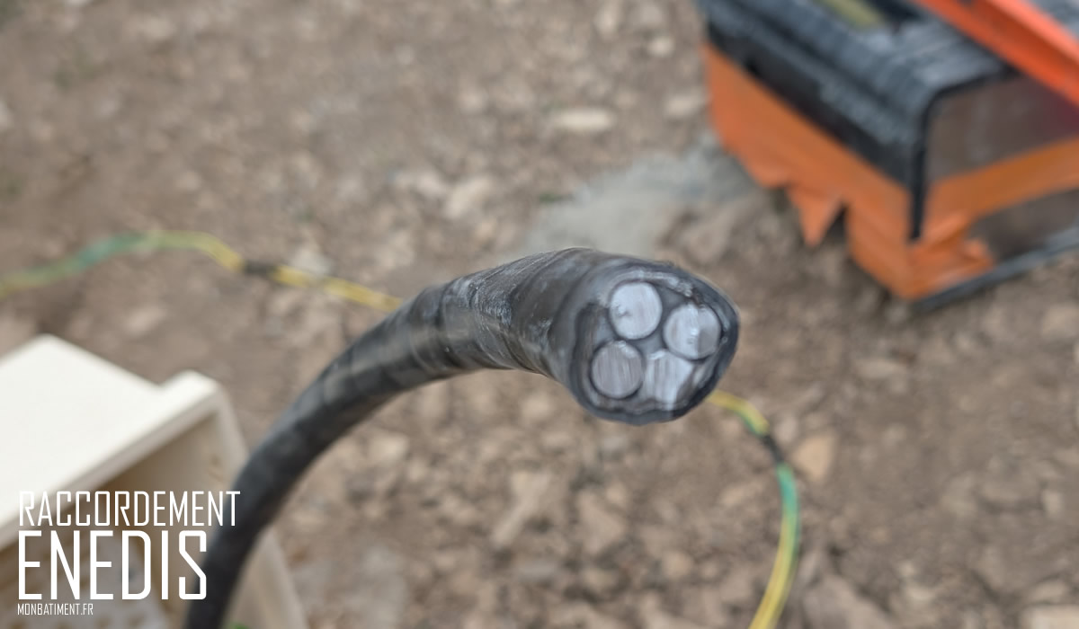 Le 4 brins fourni par ENEDIS est en aluminium, de section 4 * 35. C’est assez imposant. Ce dernier va relier les 3 phases et le neutre jusqu’ au boîtier de raccordement extérieur (la logette). De là inutile de tirer un aussi gros câble car nous repartirons en mono, avec 2 brins de 25 mm. Le tout dans une gaine IK10 de 75 mm de diamètre que nous avons préalablement tirée sans la couder, pour les besoins de notre chantier école.