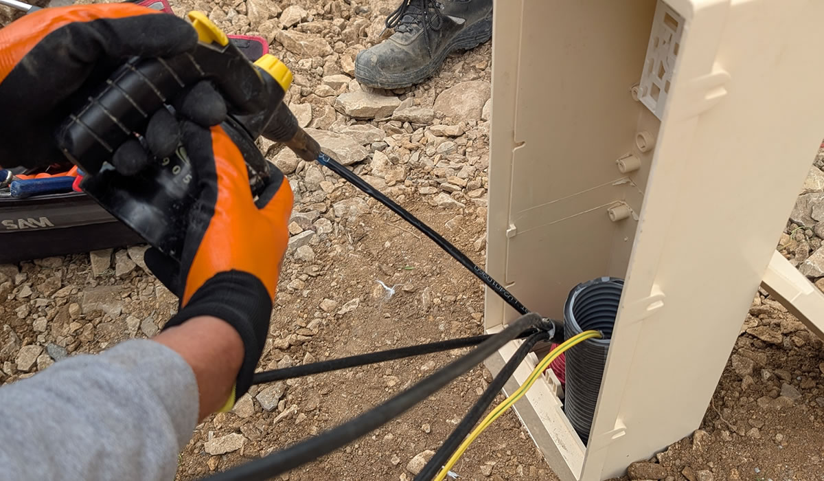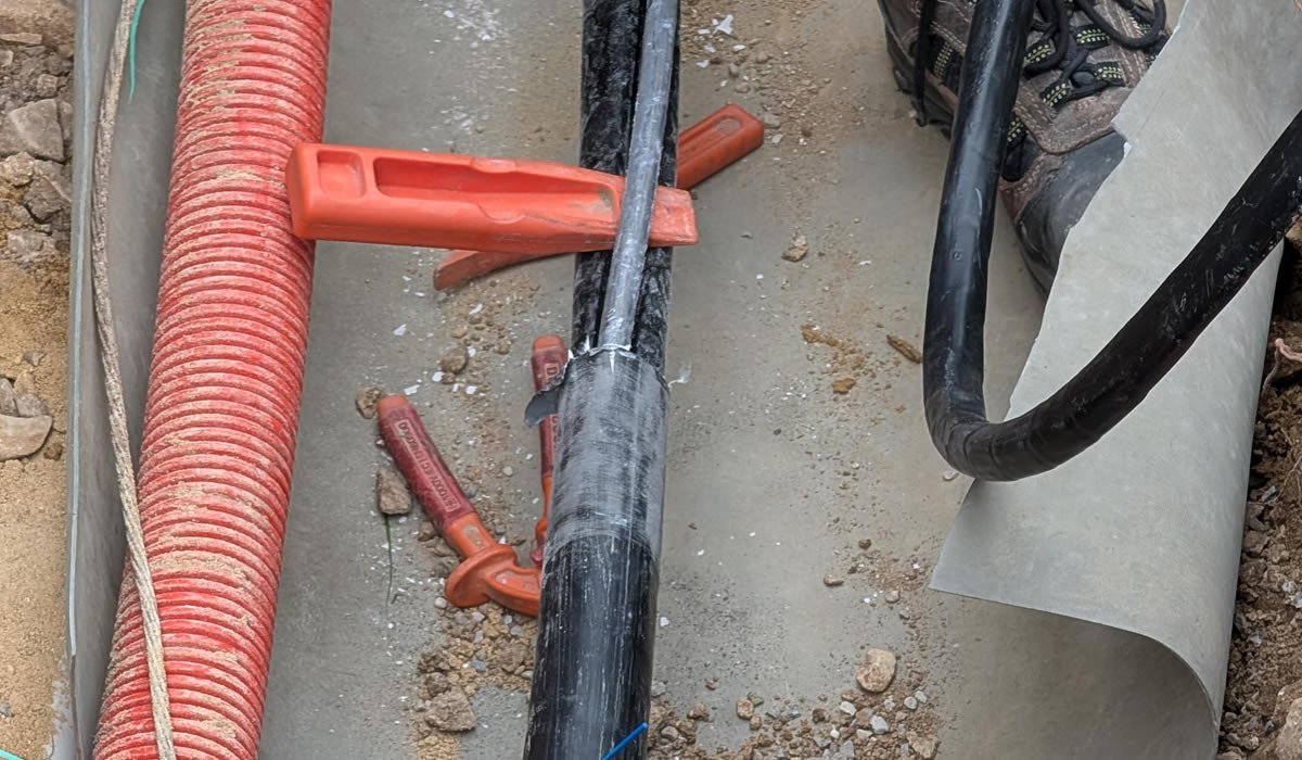 Décaisser le terrain, rocailleux dans notre cas, et ouvrir si possible très large. Protéger les abords, ne pas taper dans le câble principal et laisser les terres à proximité. Offrir à celui qui fait le raccordement un espace de travail confortable, donc peaufiner la fouille manuellement avec une pelle, c’est du boulot. Nos gars le font avec un professionnalisme certain, tout est propre et le « trou » est balisé. Il faut noter que nous sommes à -1.50 m du terrain naturel. Ceci prendra la première demi journée.