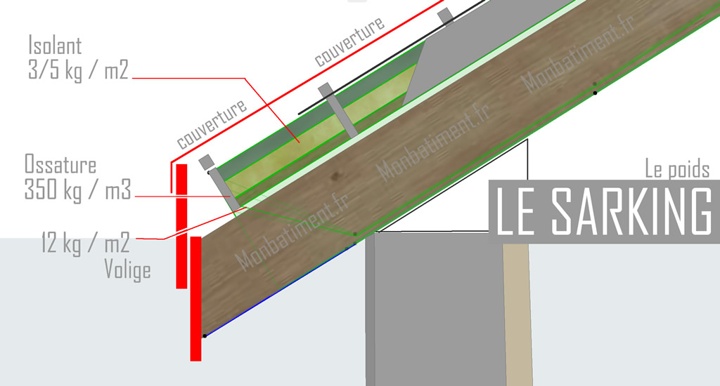 L’ossature intermédiaire nécessaire, ainsi que le voligeage (platelage OSB, CTBH, etc.) sont les principaux éléments ajoutant du poids. Notamment les panneaux de structures qui sont véritablement très lourds (12 à 15 kg au m2).
