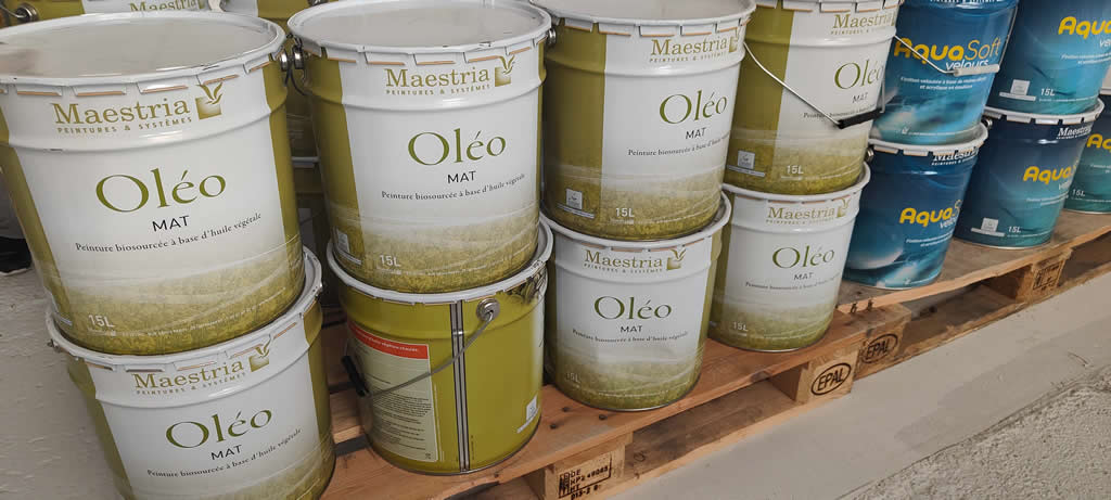 Ci-dessus : La gamme biosourcée Oléo chez Maestria, enfin disponible dans la Drôme chez Val’Drôme Peinture.