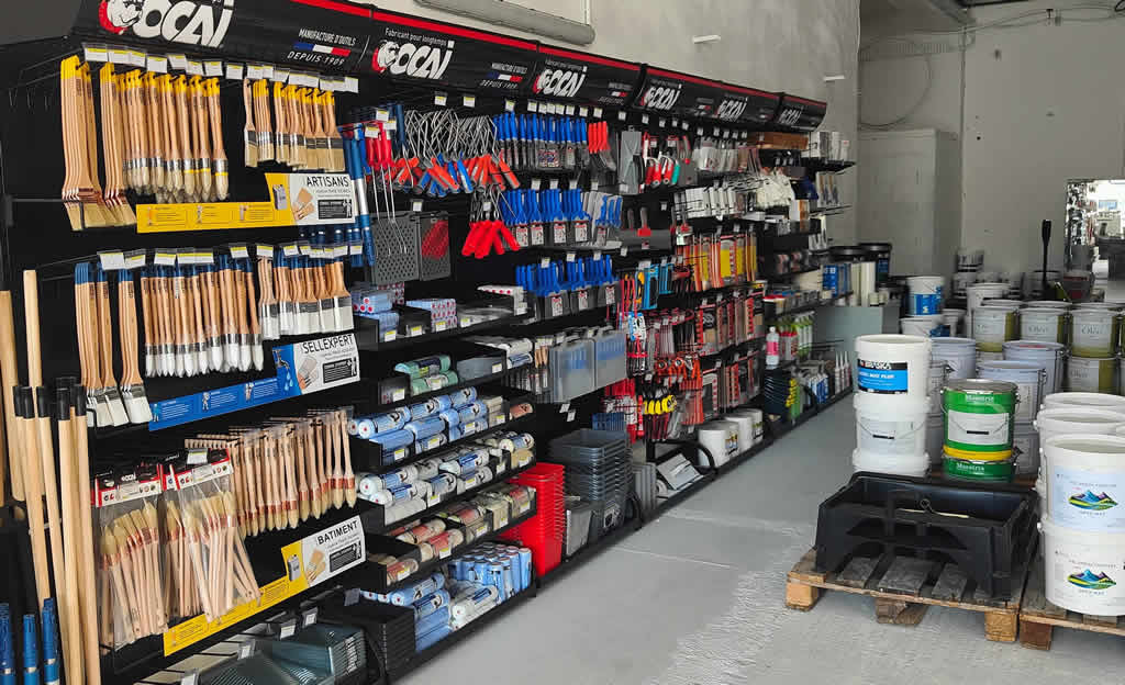 Ci-dessus : L’espace de vente du magasin Val’Drôme Peinture à Aouste Sur Sye (Drôme)