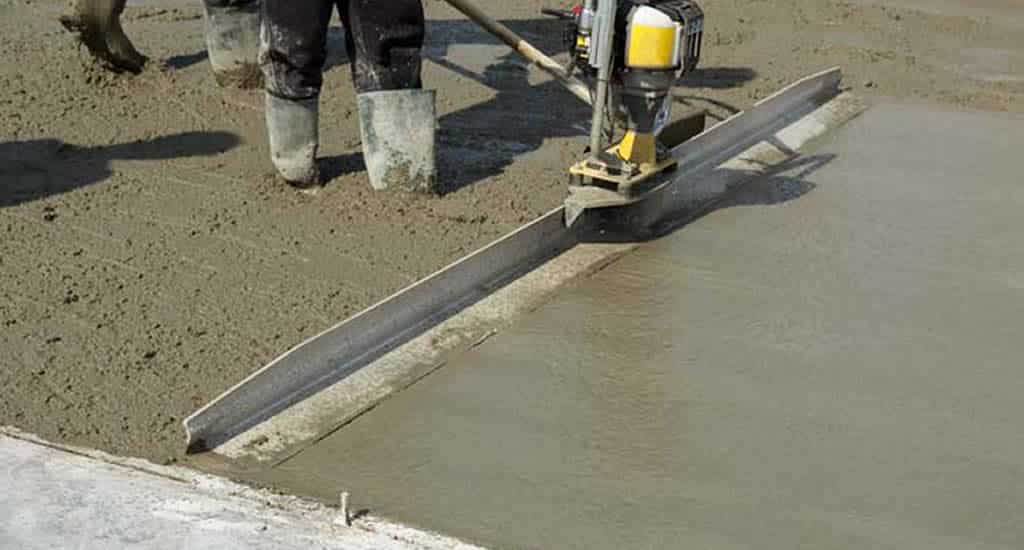 Ci-dessus : Utilisation d’une règle vibrante (ou platoir vibrant) pour lisser et vibrer le béton. Source : Betonix.be